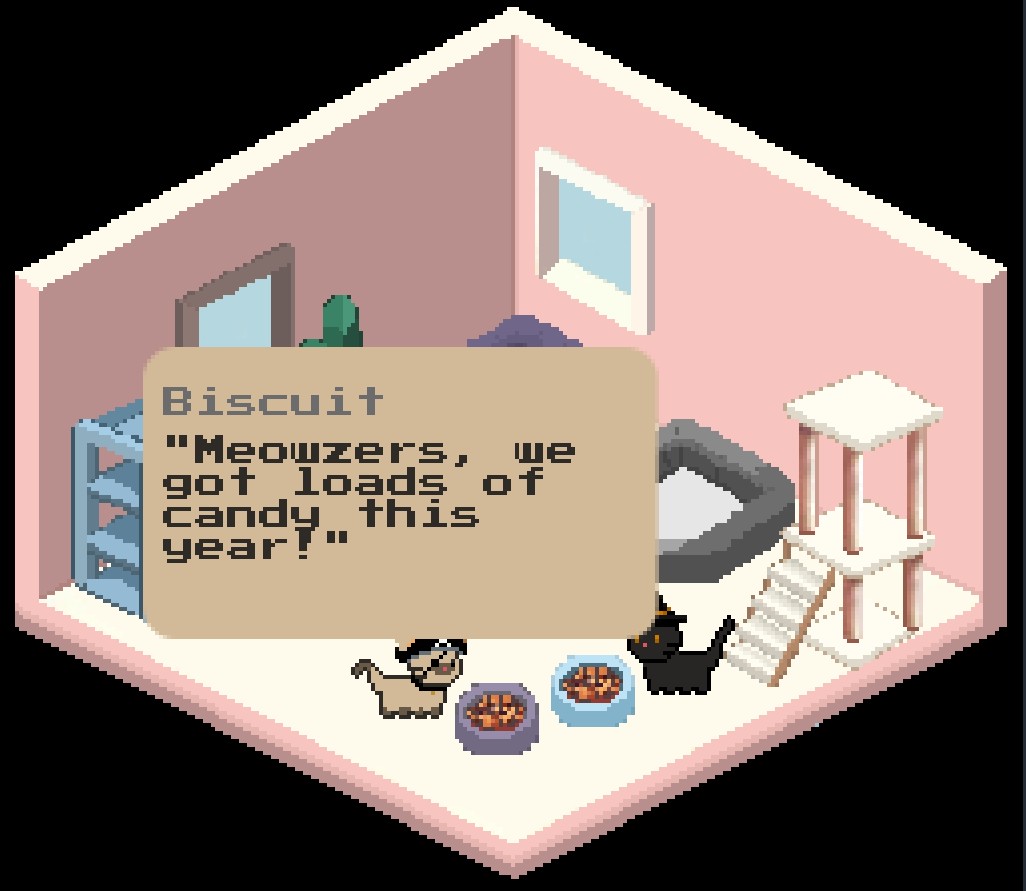 Biscuit must save her friend Bagel by finding the antidote for the poisoned Halloween candy Bagel ate. Adventure top-down, platformer, flappy because cats are chaotic.